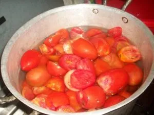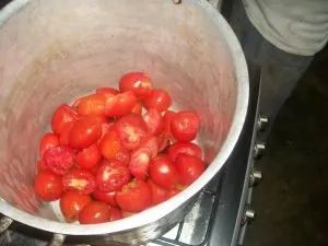 Una vez en la cocina, tocara el proceso de cocción este se tratara de hervir en una olla todos los tomates seleccionados y lavados previamente de esta manera garantizamos dos cosas, que el calor termine de matar los microorganismos benignos y que sea mas fácil su proceso final. Por lo que pondremos agua en la olla o en el envase metálico, donde le agregamos sal al gusto y la dejamos durante mucho tiempo al fuego. Cuando observemos que el tomate esta vuelto casi agua, dejamos de hervirlo.