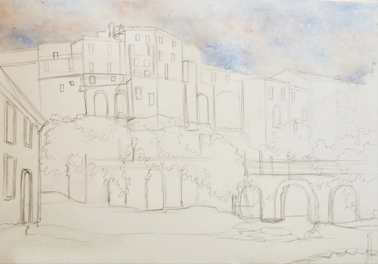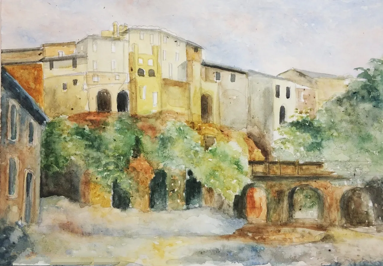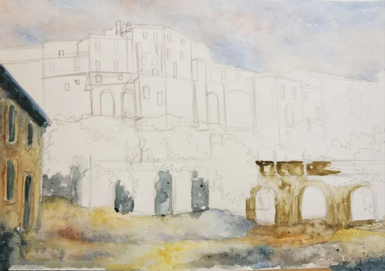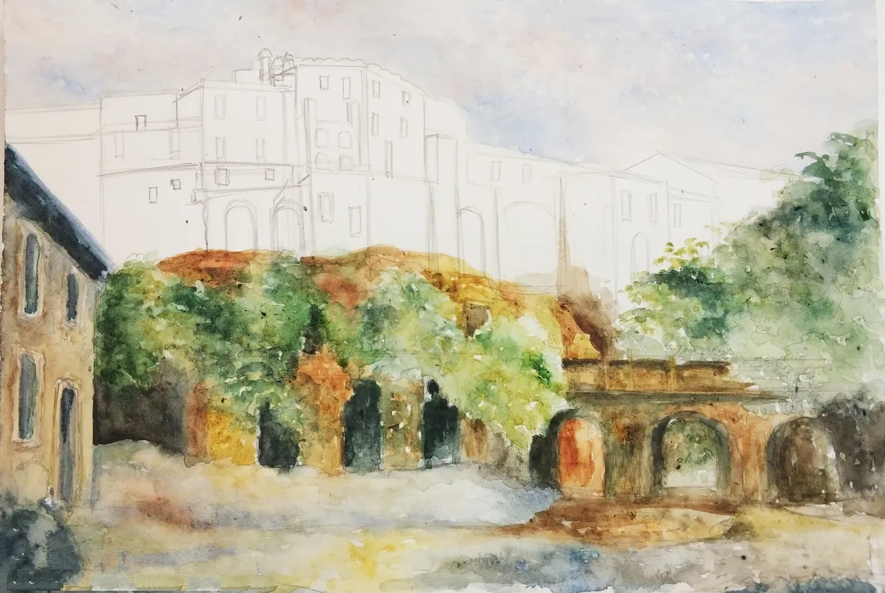 Then I compacted the underpainting with white gouache. Gouache was mixed with watercolor paints and I put it on watercolor strokes. I painted clouds in the sky (mixing white gouache with blue and red colors), the foliage of the trees (mixing gouache with green paint and ocher) and the walls of houses (mixing gouache with ocher and umber-burned).