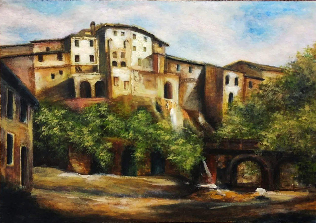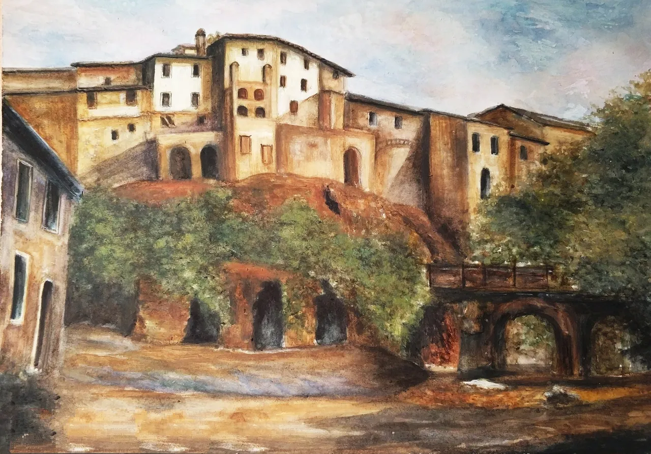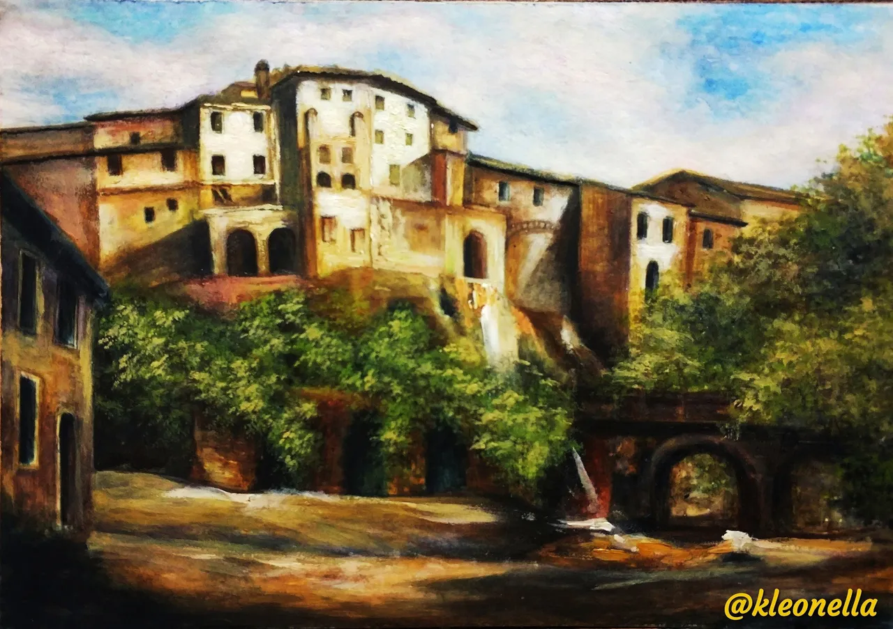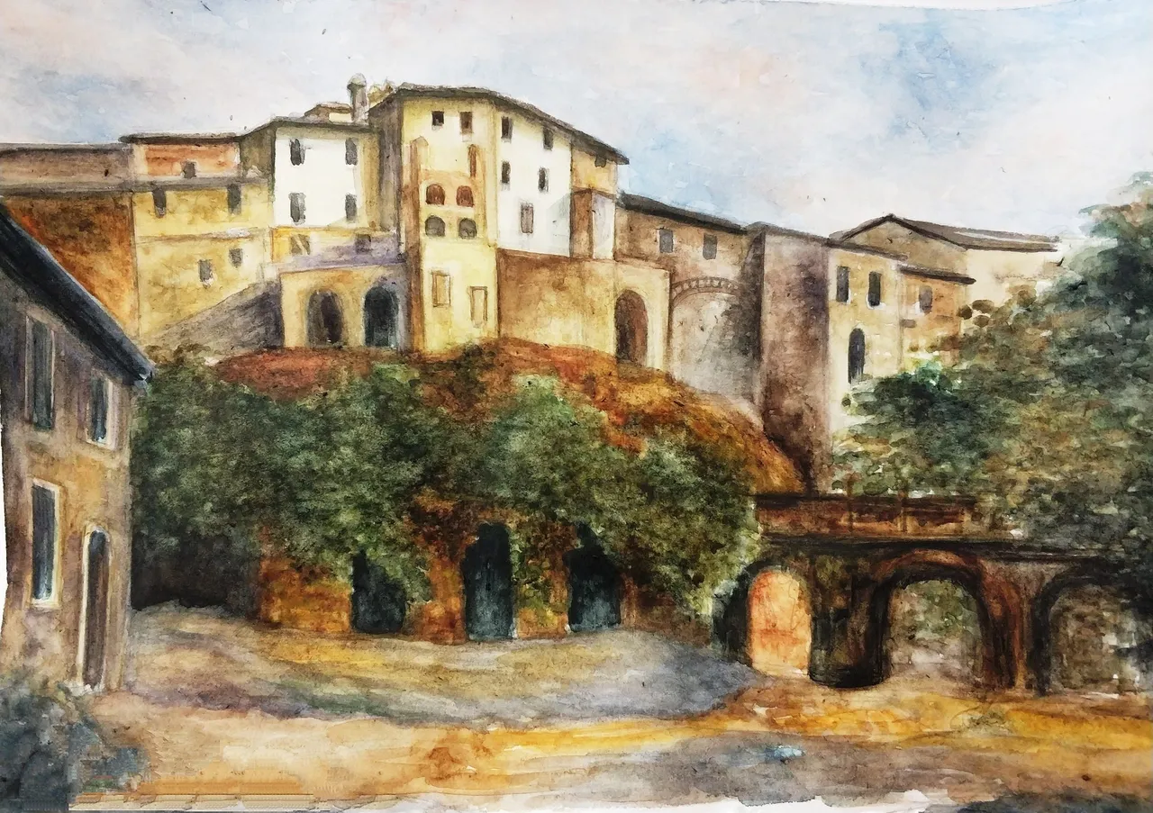 Then I compacted the underpainting with white gouache. Gouache was mixed with watercolor paints and I put it on watercolor strokes. I painted clouds in the sky (mixing white gouache with blue and red colors), the foliage of the trees (mixing gouache with green paint and ocher) and the walls of houses (mixing gouache with ocher and umber-burned).