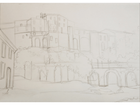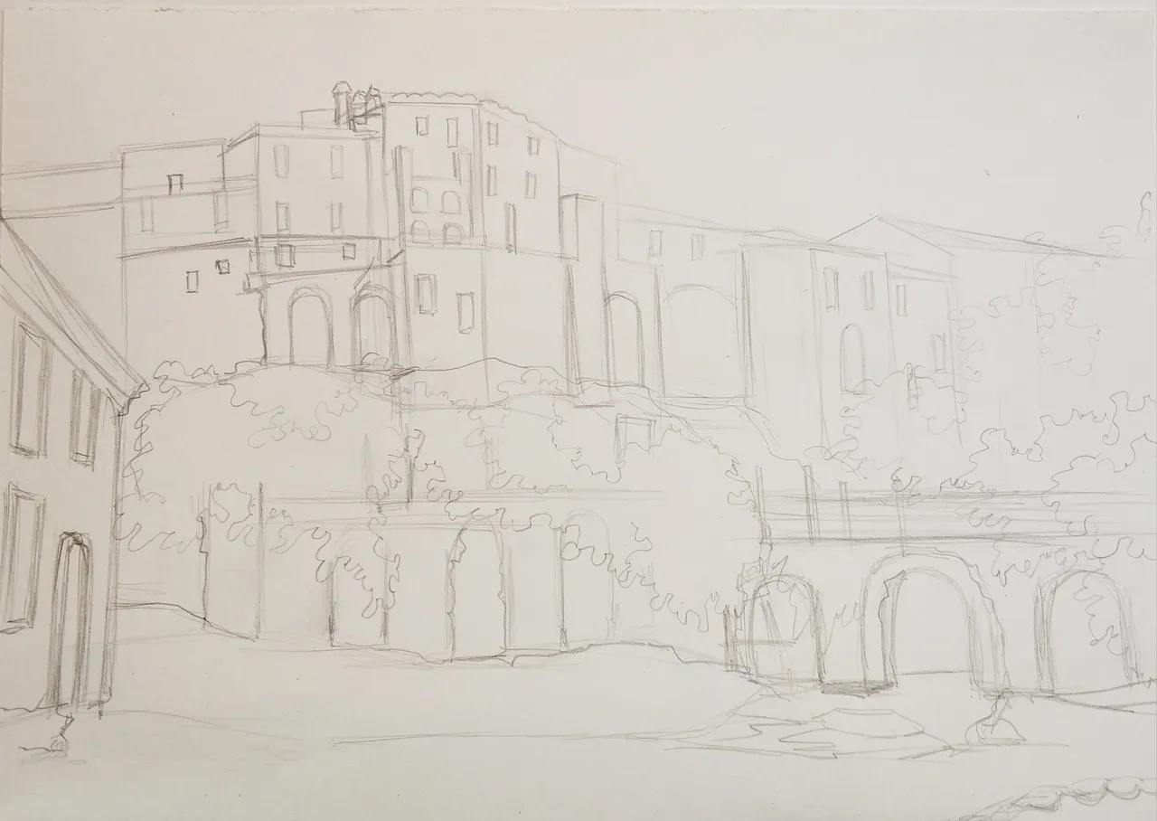 First, I drew the contours of the picture with a hard graphite pencil. I drew the contours of houses, crowns of trees and a pond.