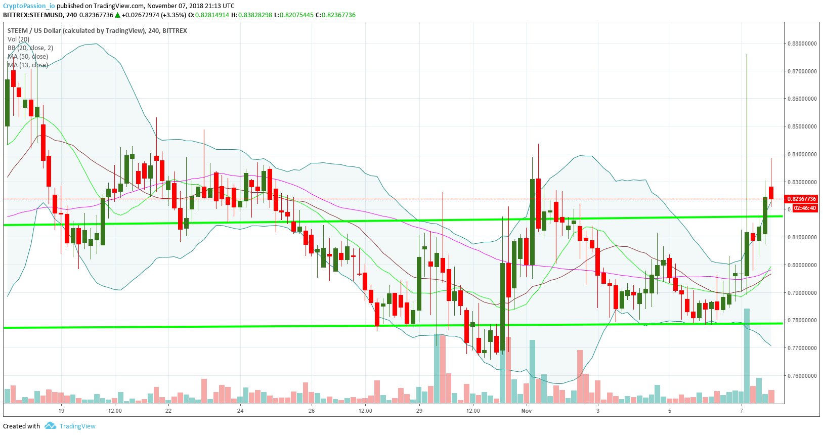 The correction on the BTC created a pull back on the STEEM. Yesterday, we have been able to break shortly the resistance line on the STEEM around 0.81$ but the correction on the BTC forced us to go back inside the trading canal. We need now to wait the start of a new trend and see in which direction the market will go out of that trading canal.