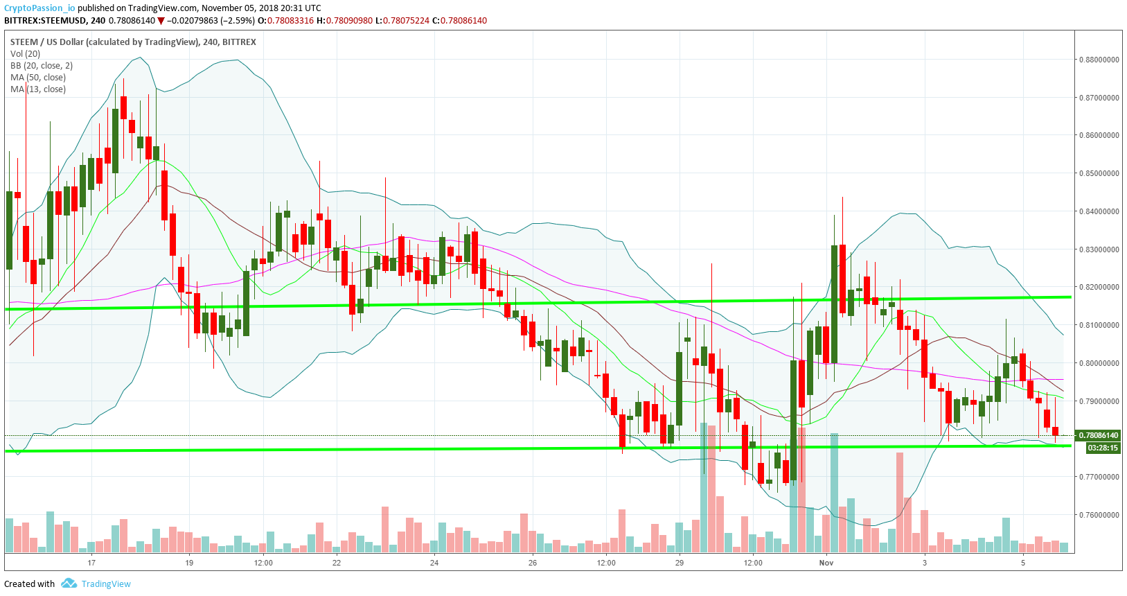 We will touch very soon again the support line around 0.77$. As we had the previous times, we must have a bounce when we will touch that support line. If we don't want that the STEEM tries to do new lows, this support line must hold any drop and any attempt to break it. On the other side, if we have again a new bounce from it, it will really confirm that this line is strong and the market could decide to make a very nice UP during the bounce. Let's see.