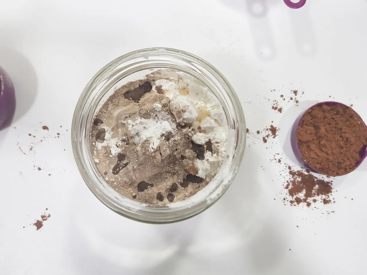 In a jar, combine all ingredients, except cacao powder. Put the lid on and shake it until all is well homogenized.