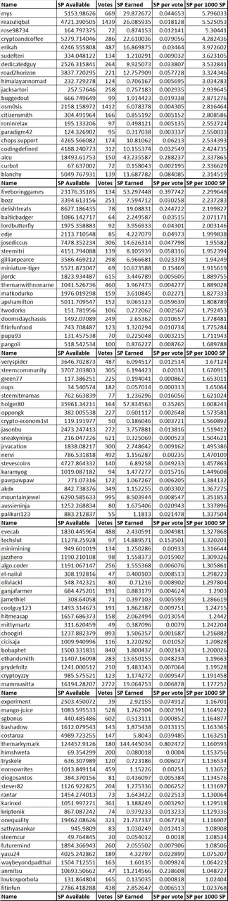 NOTE: If you have started a power-down or been involved in delegations in/out of your account, you will not appear on this list for 15 days following the activities above. Thanks!