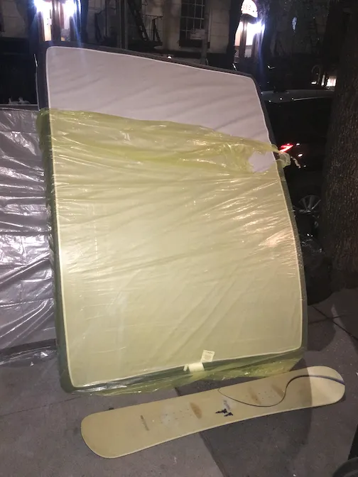 A sketchy large man with rings on almost all of his fingers walked up out of nowhere. He was looking for valuables as well, but came up right to me. I carry a pocket knife for protection and to cut twine, but I wasn't prepared if he was on an offensive because I was holding the mattress. It was very awkward for a moment, but I kind of broke the ice by bringing up my struggle to feel him out... I'd take a guess and 99% of people would react the same way I did, but I judged a book by its cover in the name of logic and self defense at 4 AM on a dark city street.