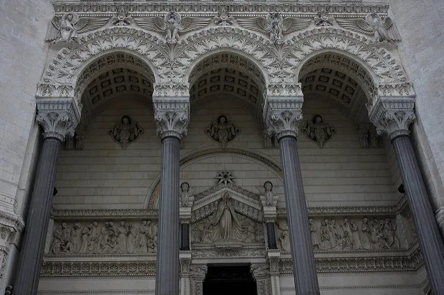 5: The arches, columns, and reliefs that mark the entrance of the Basilica of Notre-Dame de Fourvière