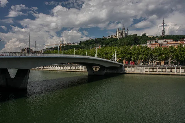 1: A bridge across the Saône, leading to Fourvière hill and the Basilica of Notre-Dame de Fourvière, as well as the Metallic Tower, which predates the Eiffel Tower by 3 years.