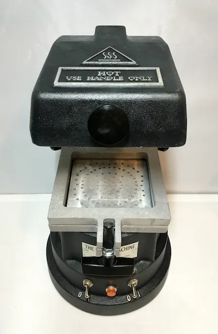 I found the problem, and both repaired and reinforced it so it'd never happen again. It was a very interesting and powerful heat/vacuum machine when in action. I sold it to an orthodontics school in California for $185. Full DIY repair post here that virtually nobody saw.