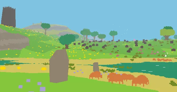 The island is drawn in a pixel art kind and involves hills, trees, buildings, and animals akin to frogs and rabbits, though the design is one of a kind whenever the sport is played.