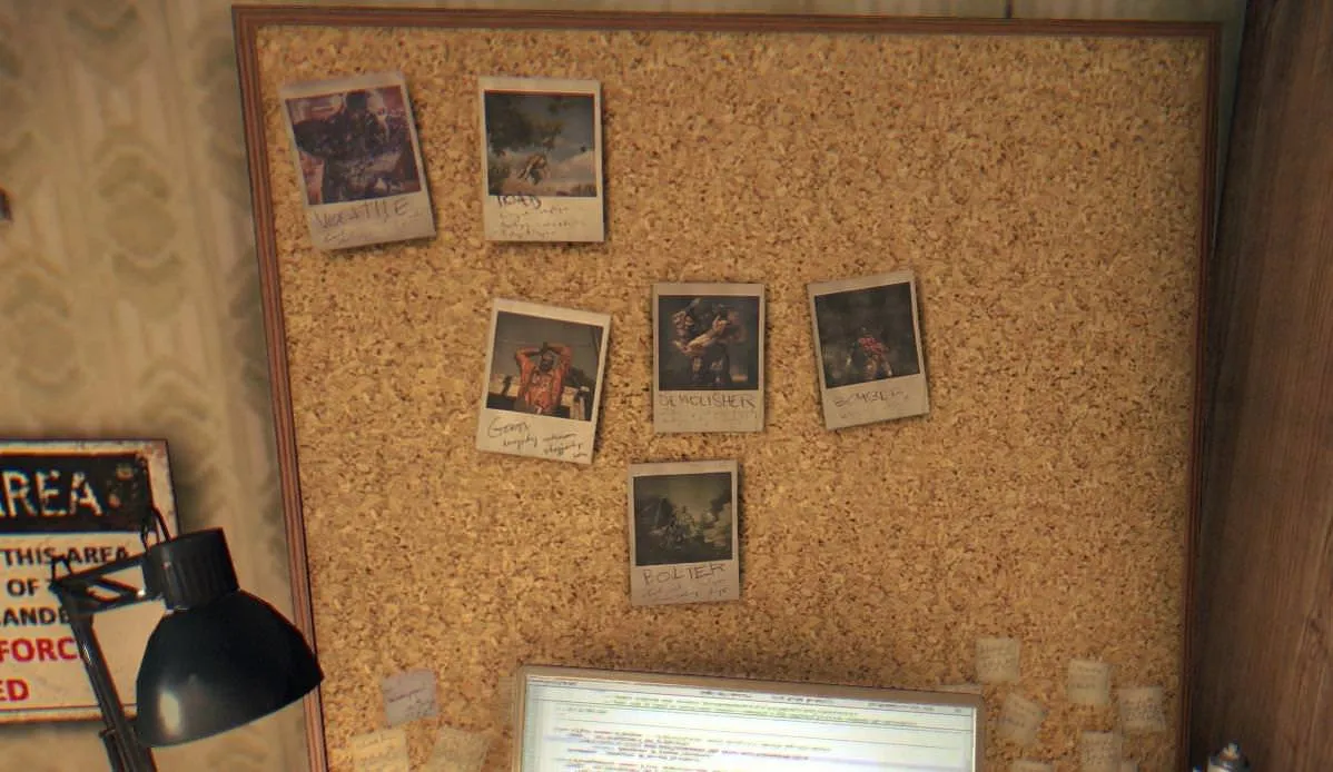 In Crane's room in the Tower, there is a computer desk in front of that guitar. Pay attention to the board behind it and you can see that Crane's been learning since the beginning. Each new enemy you meet in the game will add the pictures of them on the board, full with their name and the short descriptions below them. Although they are not readable, it's still awesome. I wonder when did Crane had the time to take their pictures, though.