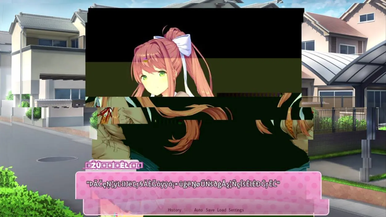 In Act 2, everything started from the beginning like normal except Sayori is no longer exist, and of course the main protagonist act like everything is normal. But the opening scene script didn't change to match the situation, making the main protagonist say the same thing as in Act 1 resulting in Sayori's name to be glitched like, "That girl is ÒŽÚWwÍHËÍäÄì, my neighbor and good friend since we were children.".