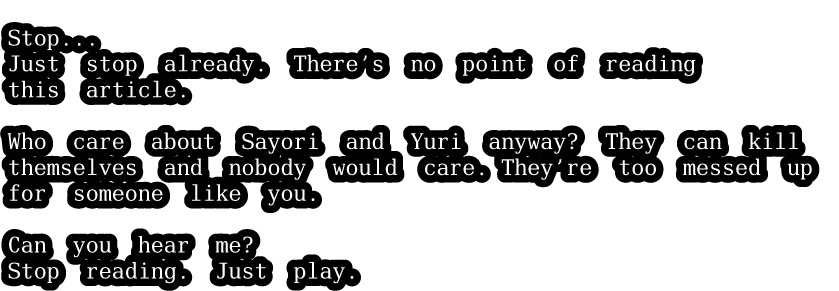 From this moment I started to smell some Undertale's 4th wall breaking capability, messing with the game files and all that. Not only that, more files were added; a picture of child-like drawing of hanged Sayori, and two more .txt files that contains a poem and a message, calling to the player.
