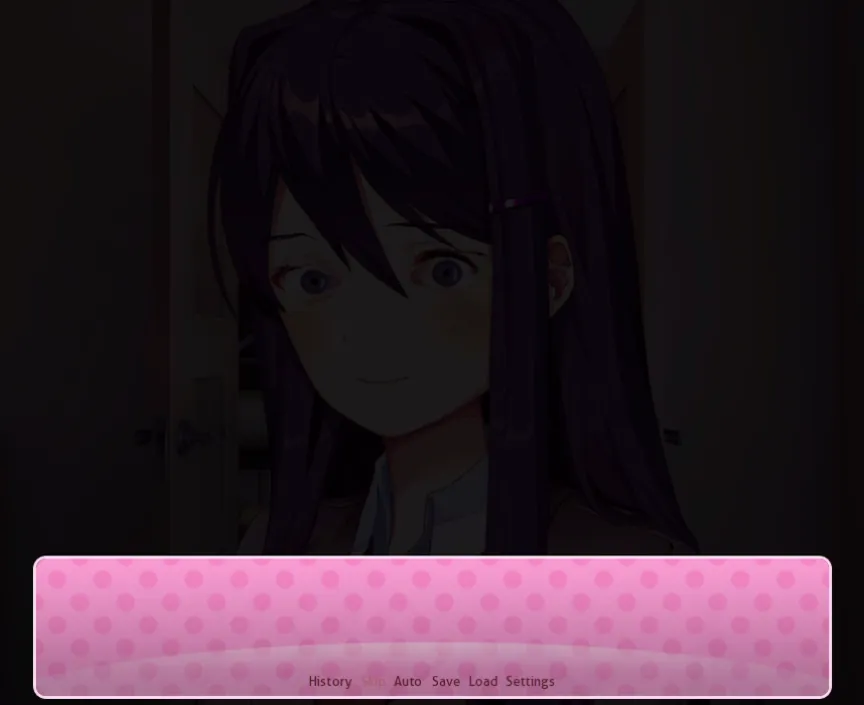 Yuri grab the main protagonist's arm forcefully and take him into the closet on the back of the classroom. The screen goes dark but not pitch black. I can still see Yuri standing way closer than usual to the screen with eerie expression on her face. It became more unsettling with static sound playing along with the sound of loud heartbeat.