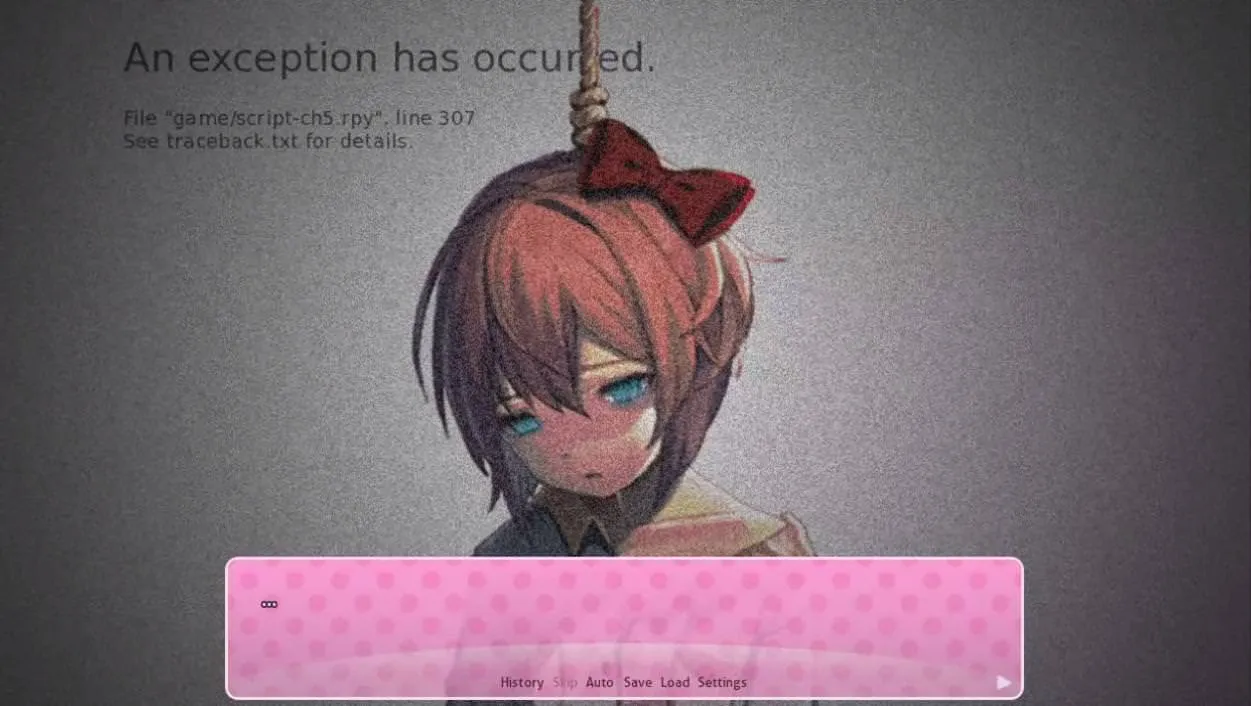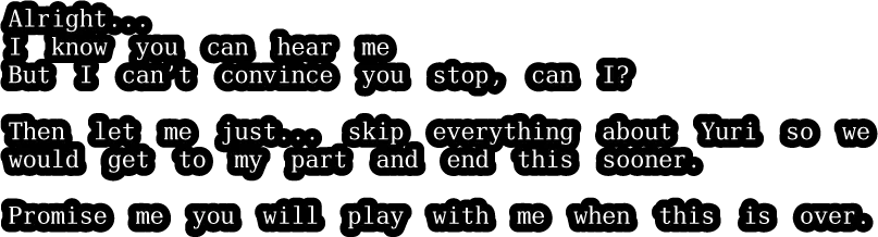 Not only Yuri, the game itself getting more and more glitchy as well. From time to time, I saw the hints and got the feeling that the 4th wall breaker is Monika.