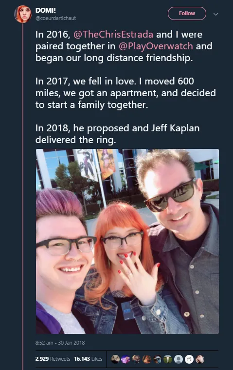 Never thought the most despised feature in video game could be so romantic, do you? Chris brought Dominique to Blizzard Headquarter and Dominique thought it was for a tour. Turns out, Jeff Kaplan walked up to her, and handed over a loot box with a gift of a lifetime inside.