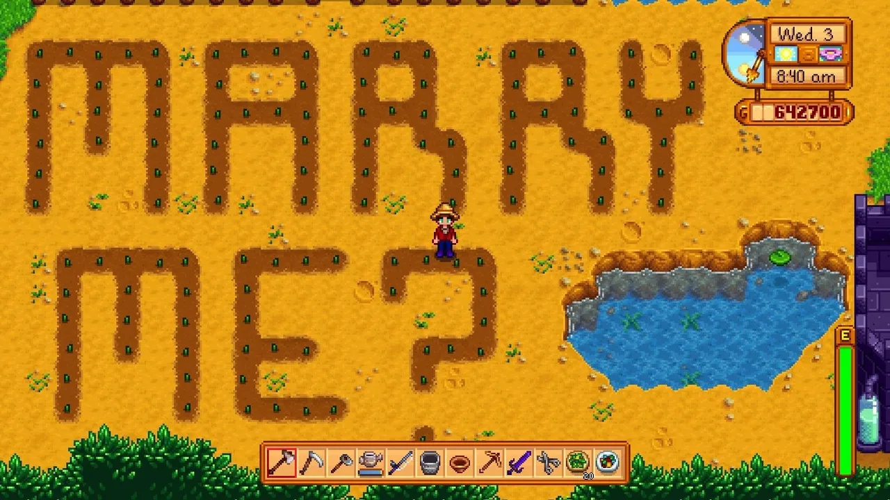 His fiancée Vana Springer posted a screenshot that of the best day of her life on Stardew Valley subreddit a month ago, showing what appears to be Adam's character standing on a field tiled in such way to spell the question. And it made an instant 8 hearts event, if you catch my meaning.