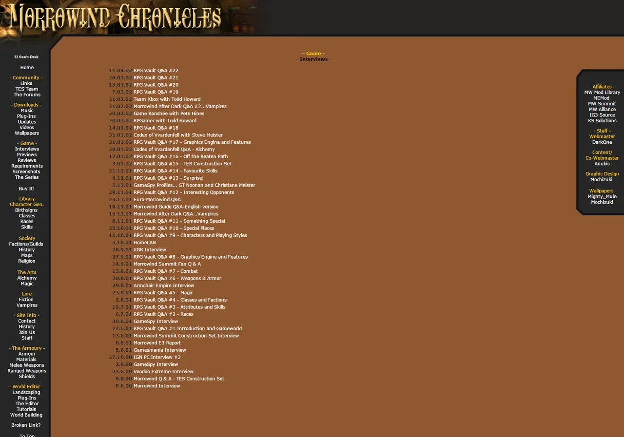 Founded by Robin Scott aka Dark0ne back in 2001 as a fansite of The Elder Scrolls III: Morrowind called Morrowind Chronicles, and Morrowind Mod Library as the extension for hosting Morrowind mods (open in new tab to enlarge).