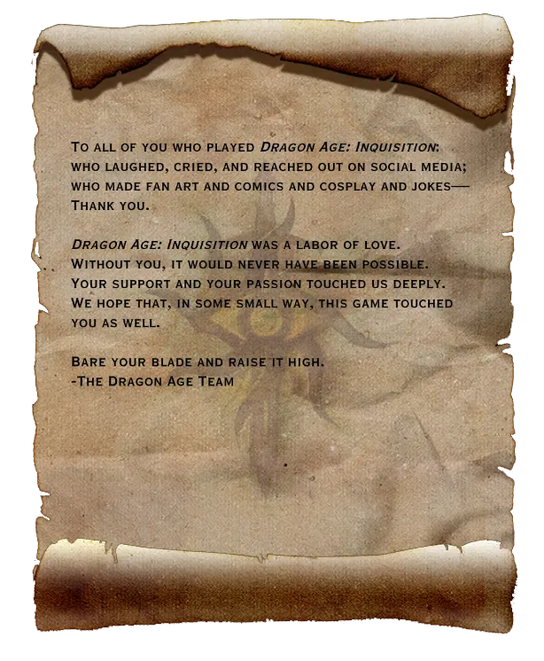 So much had happened in the Dragon Age universe, from the story of the Warden, the Champion, the Inquisitor, and those who fight alongside them. Not to mention the books. Let's take a look back to the little message written by BioWare's Dragon Age Team;