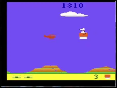 The Red Baron is devious, frequently swooping out of the clouds (where Snoopy's doghouse cannot travel) and gunning for the brave pilot of the Sopwith Doghouse. Snoopy's armed with his own machine gun which has two fire modes: burst-fire for close-range combat, engaged by holding down the fire button, and single-shot for long-rage action, engaged by tapping the fire button. During combat, the Baron will occasionally toss out a tasty treat which Snoopy will want to grab, but the player has to be careful: every so often the scheming German will release a skull and crossbones which, if collected, robs Snoopy of all his collected goodies so far. This is a big deal because the only way to score extra lives is to catch all the goodies the Red Barron drops and shoot him down enough times to complete the level.