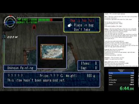 So what exactly is Everblue 2? It's hard to explain what makes it so much fun, but much like The Guardian Legend on the NES, it's a mixtures of genres that all work surprisingly well together. The story's ripped from your typical adventure game where you wander into new territory and complete quests in exchange for money or other stuff. But then you also have equipment you need to upgrade and stats to monitor while you're exploring and this, along with all the treasures and assorted gizmos you pick up while diving give it a very RPG-esque feeling. Then there's the resource management issue which lends a survival aspect to the game: once you descend below the waves, you're on a firm time limit based on the amount of air in your scuba tank. In addition, you're also limited on storage capacity based on the bag you have equipped and the amount of hit points you have: you can pick up more than your bag can hold, but doing so saps your HP slowly until you either toss enough weight out of the bag to get it under capacity or get to the surface. The game warns you if picking up a given item will exceed your storage limit so you'll know before it happens, but especially in the early game where the salvage is small and not worth much, this introduces a nice risk vs. reward dynamic where you'll find yourself wondering if you can add that lamp to your inventory and still have enough HP to get outside to surface. If you hit 0 HP while underwater, that's a game over. Hitting zero air isn't an instant death, but you will take massive damage every few seconds until you drown, so there's no time to mess around. Make sure you don't lose track of your oxygen supply and find yourself stranded past the point of no return.