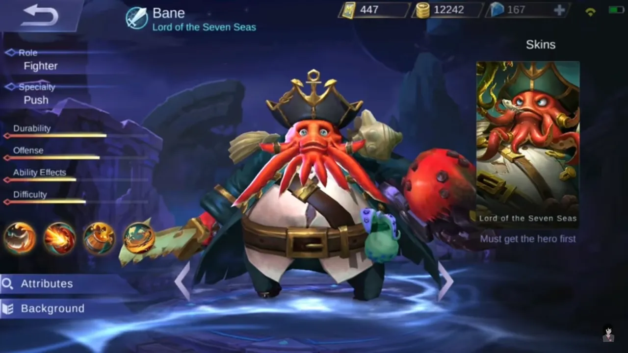 sourceHero yang terakhir ini adalah hero yang baru saja di Rework beberapa waktu lalu, memiliki kemampuan serta skill yang berbeda dari model pertamanya, yaitu setiap 6 detik sekali Bane mendapat demage fisik yang bertambah sebesar 60% demage spalsh 100%, serta akan memberikan efek slow kepada musuh, Bane juga bisa mengeluarkan serangan area berupa pusaran air yang berisi hiu pada model barunya, jika pada model lamanya Bane akan mengeluarkan kapal yang menembakan bola merim