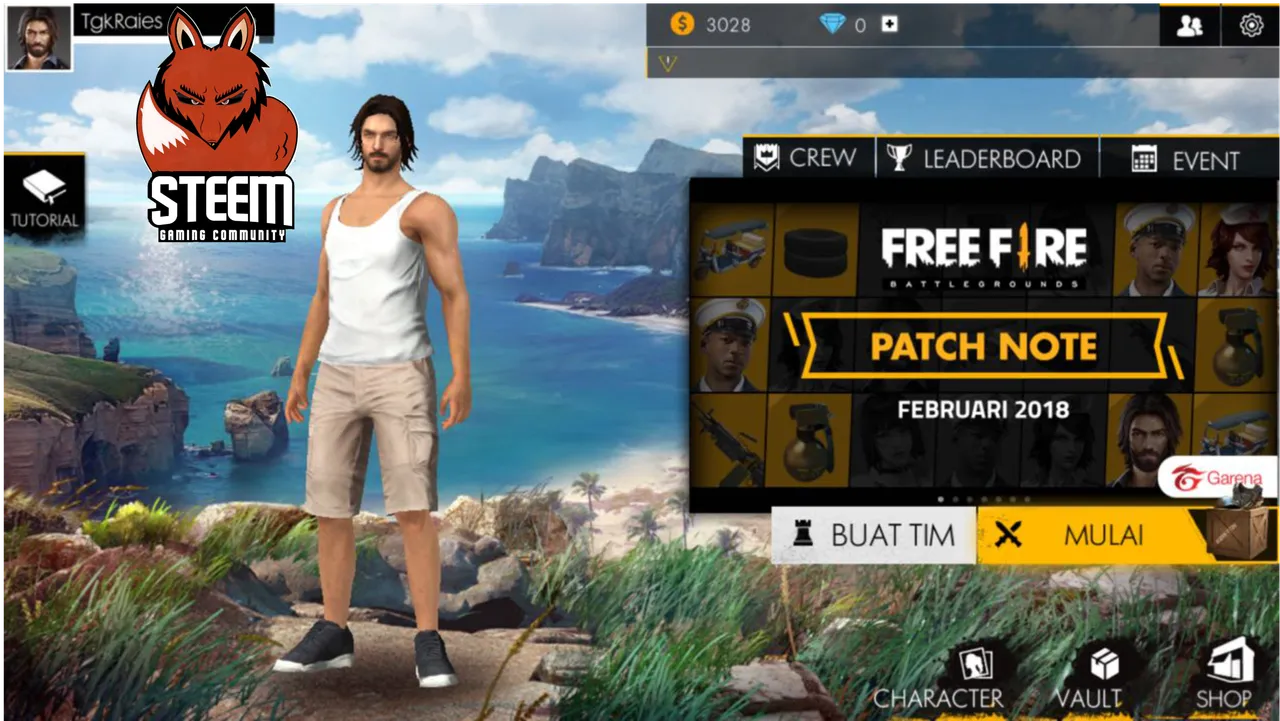 At the first time we open the free fire it will appear this page and here friends all can tweak the menu CREW, LEADERBOARD, EVENT MAKE TEAM, START CHARACTER VAULT and also SHOP