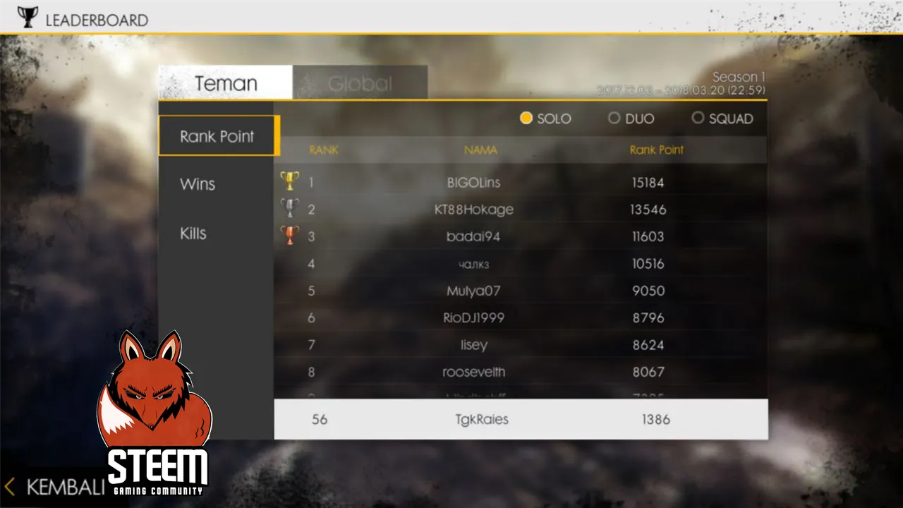 In this solo leaderboard we can rate we are better or lower than our friends, we can see anything in this solo menu, we win how many times when playing solo kill us how many times while playing solo and also our rank point how much when playing solo