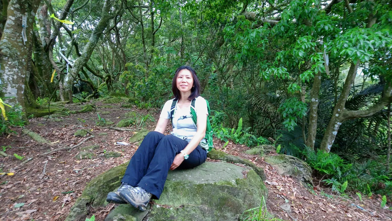 之前要跨過的木頭只是小兒科。原來步道有好幾段需要拉繩子,而我今天又沒有帶手套! 還好,我剛開始不久精力充沛,很快已爬上山坡去。之後還幫老公拍了照片。