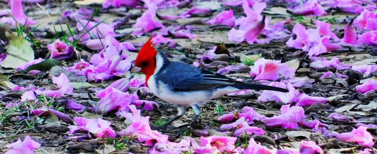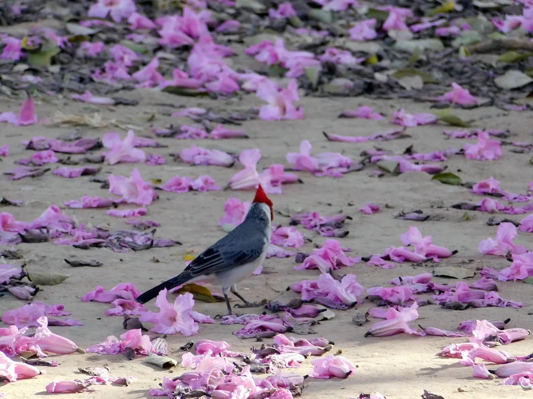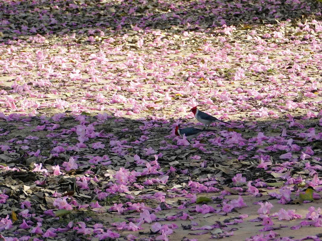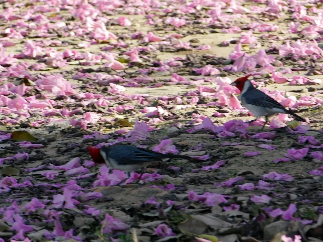 Me acerque sigilosamente con nuestra cámara ¨nikoncoolpixb500¨ preparado para disparar, miraba entre las ramas del árbol, pero para ser honesto no lo podía ver, fue entonces, y gracias a la persona que estaba sentada, quien me dijo que estaba equivocado, ya que el ¨cardenal¨ no estaba posado sobre las ramas, sino en compañía de su pareja bajo el árbol, entre las flores que habían caído al suelo, aunque no estuvo allí por mucho tiempo, fue suficiente para hacer unas tomas hermosas