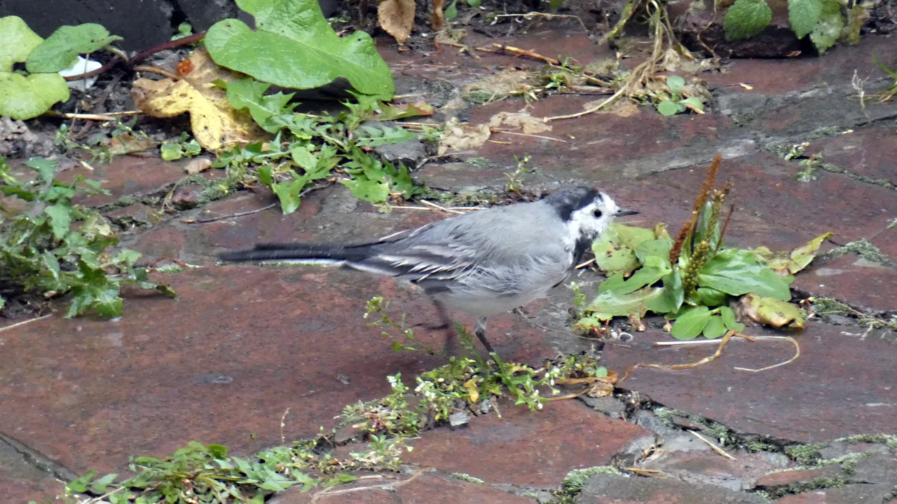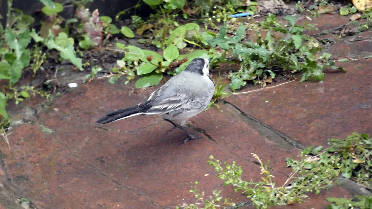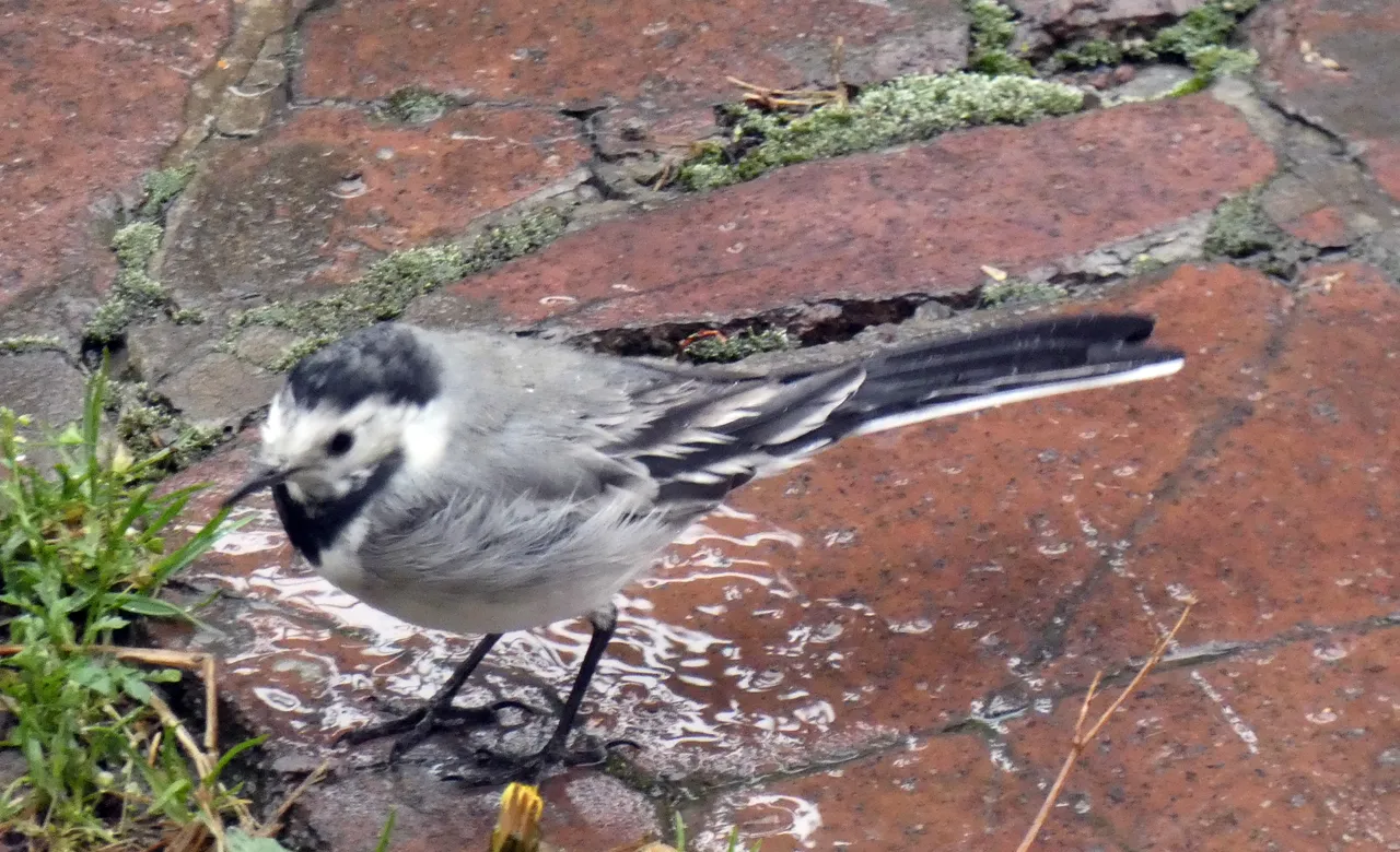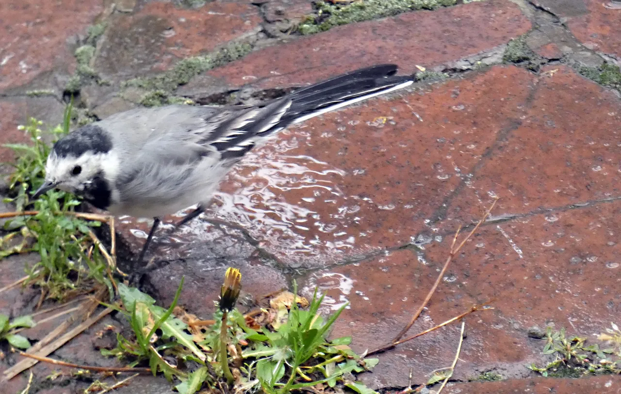 W strugach deszczu wypatrzyłem na podwórku ptaszka. Nie wiedziałem na początku co to za gatunek. Użyłem więc aparatu z zoomem. Zdjęcia nie wyszły rewelacyjnie, ale już nie miałem wątpliwości co to za ptaszek. To Pliszka siwa.