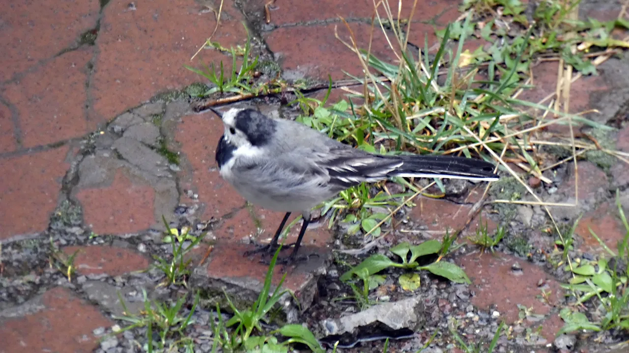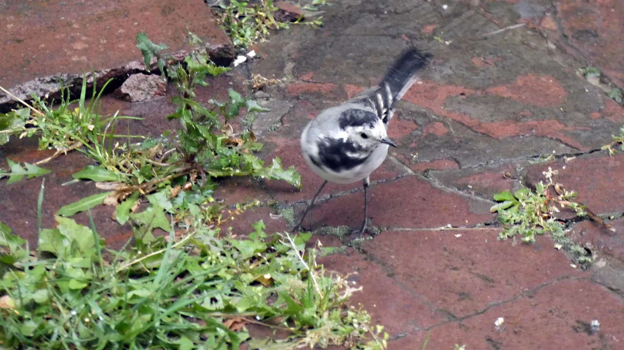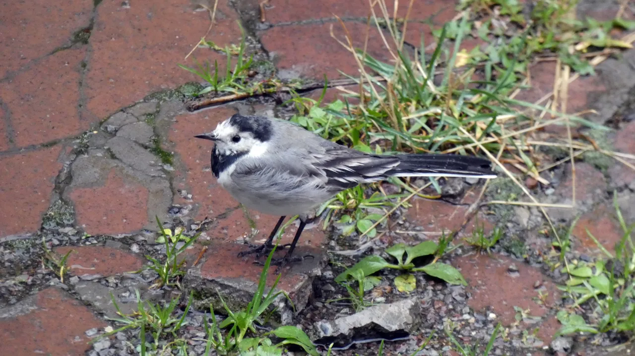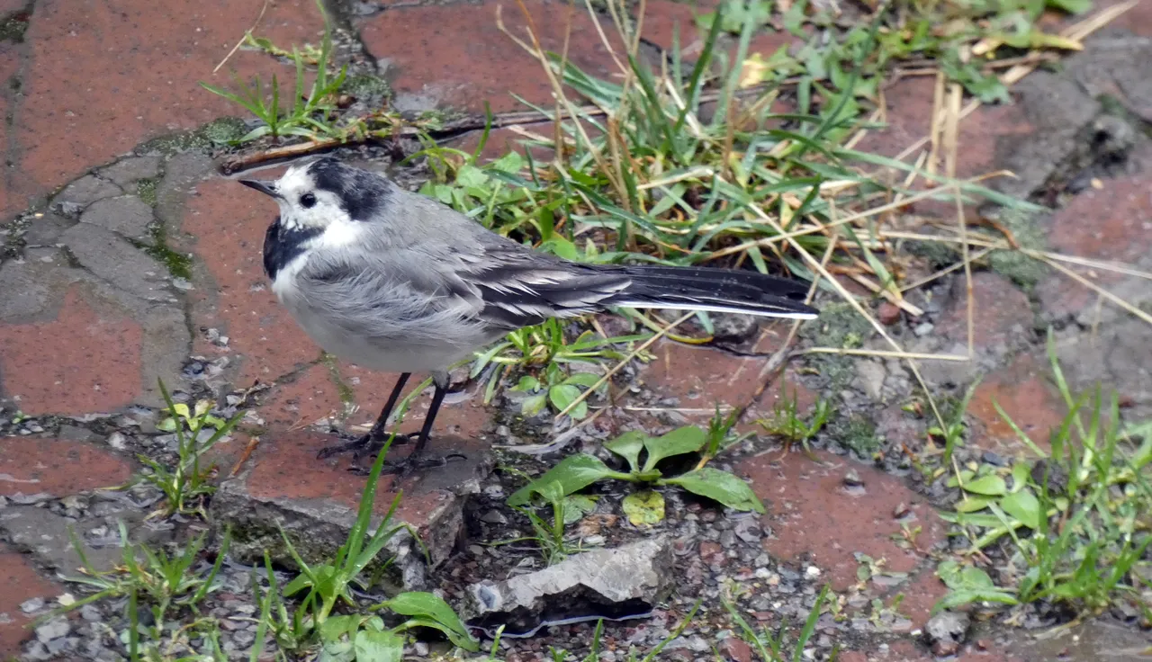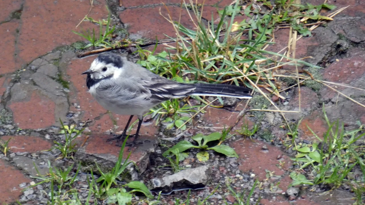 W strugach deszczu wypatrzyłem na podwórku ptaszka. Nie wiedziałem na początku co to za gatunek. Użyłem więc aparatu z zoomem. Zdjęcia nie wyszły rewelacyjnie, ale już nie miałem wątpliwości co to za ptaszek. To Pliszka siwa.