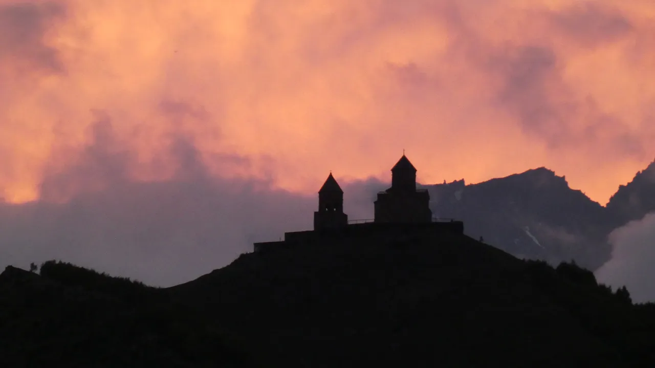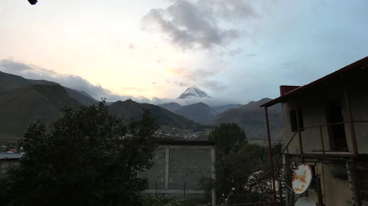 Rozciągał się z tamtą przepiękny widok na górę Kazbek, która mierzy 5047 m n.p.m.. Jako, ze byliśmy dość wysoko, klimat był już dość surowy, a rano potrafiła padać śnieg.