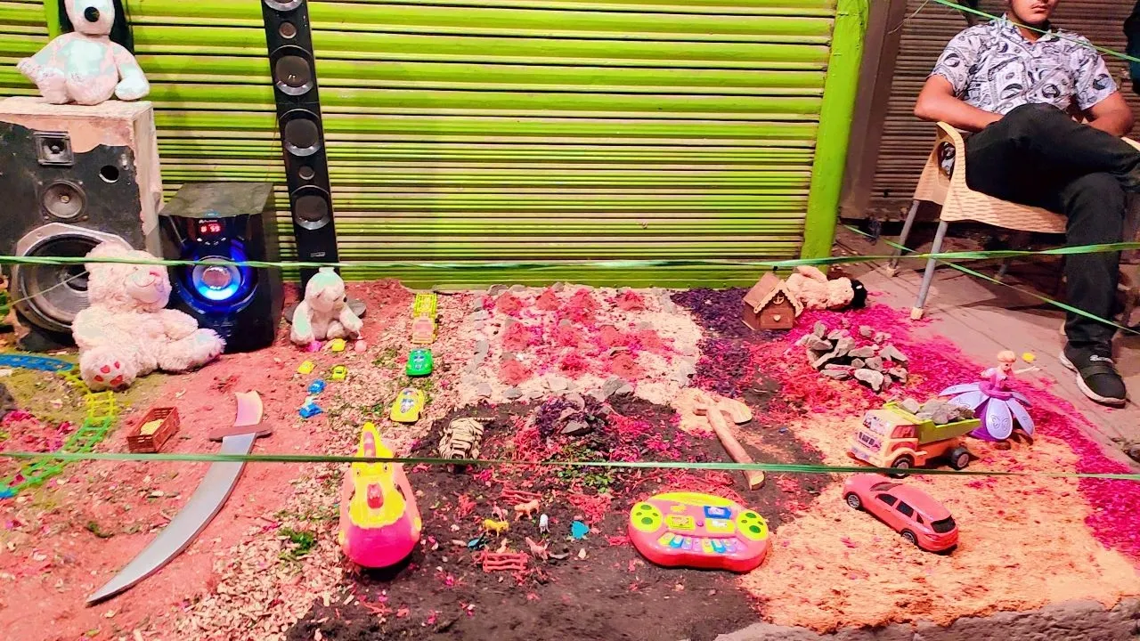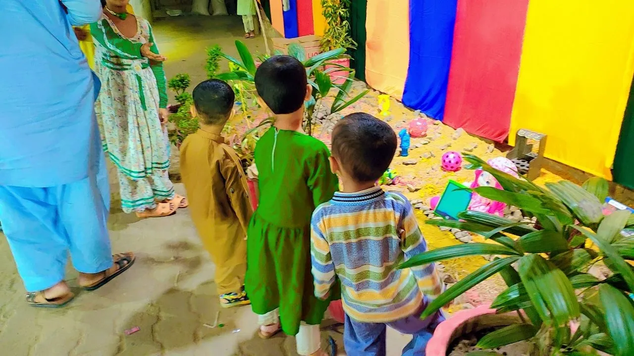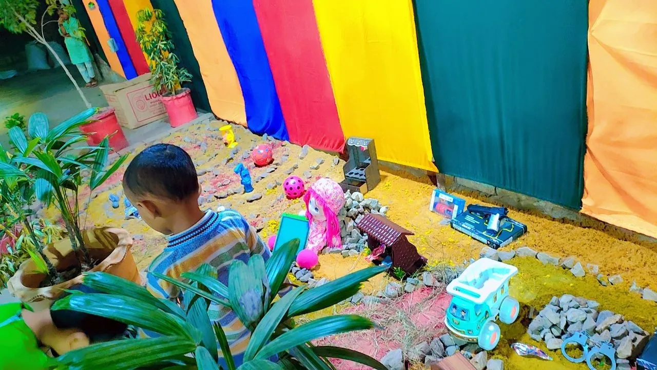 This place was decorated with beautiful stones as you can see in this picture and all the other places were also decorated with small things which made it look very beautiful. These stones were of special type. And here along with the children's toys like small houses and different toys were also kept, all these things the children brought from their home.
