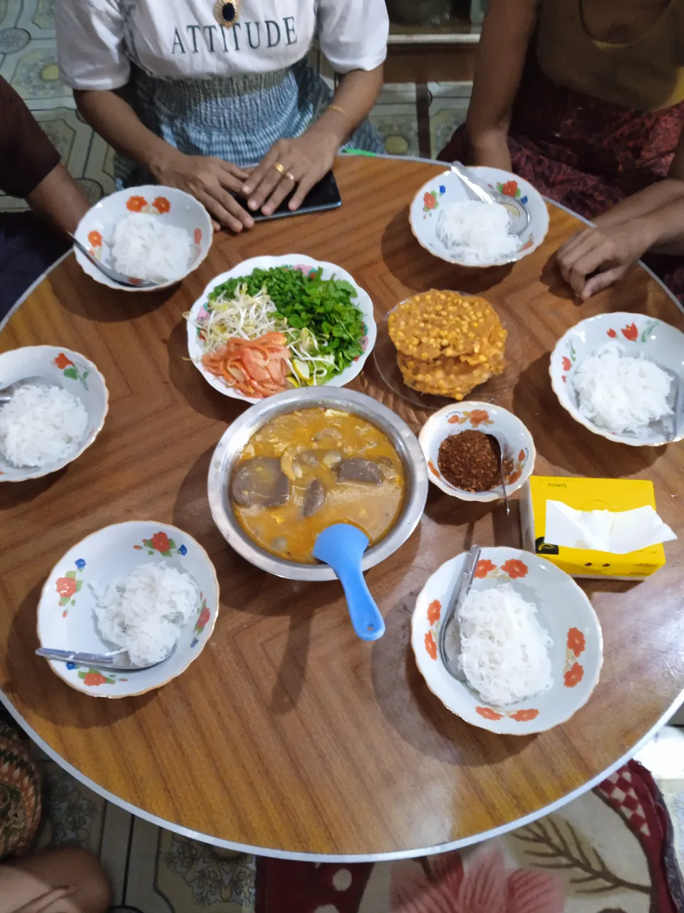 "Mote Hnin Khar" is a kind of fish soup noodles.My family are cooking More Hnin Khar in my home.