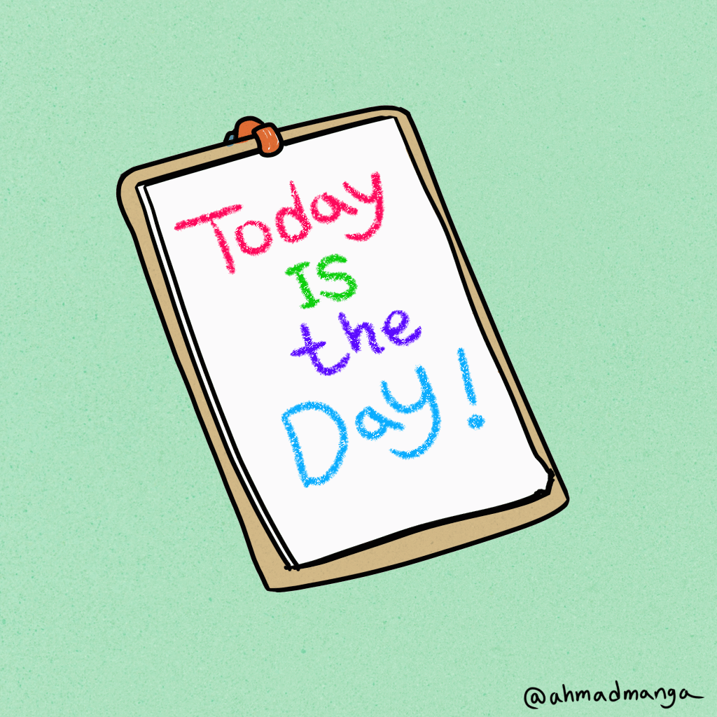 This is an animated Gif of a Clipboard with the Handwritten words "Today is the Day" appearing on it. I was inspired to make this by some images on Giphy.