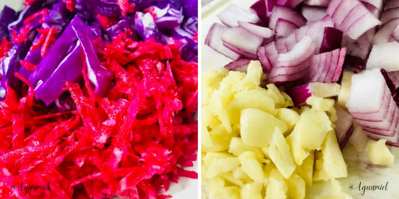 Cortamos la cebolla, el ajo, el repollo y rallamos la remolacha