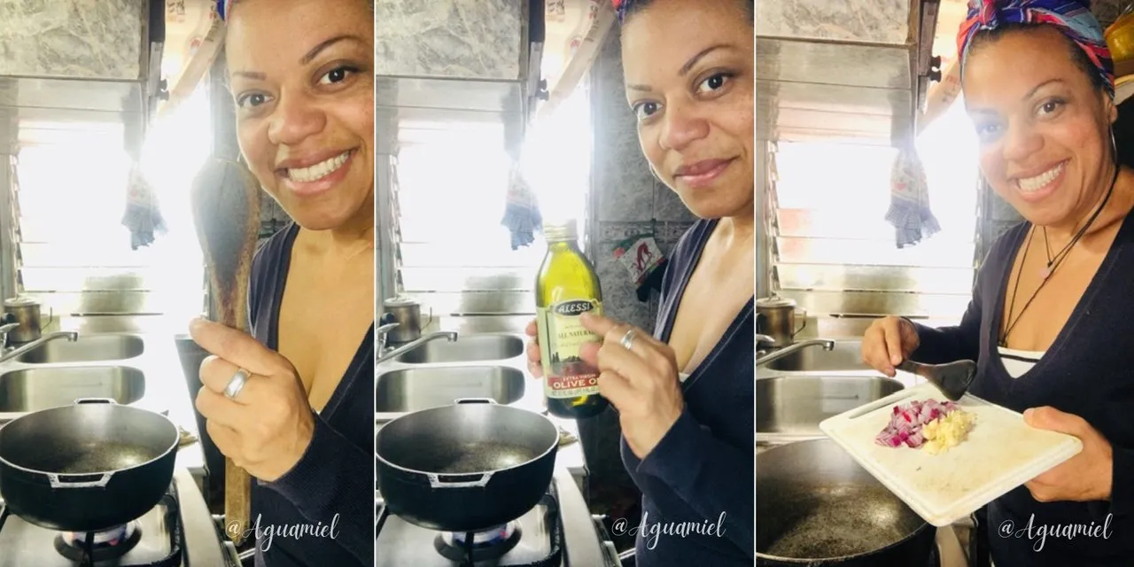 En un caldero, olla o wok caliente agregamos un chorrito de aceite de olivo, seguido colocamos la cebolla y el ajo, removemos mientras se desprenden sus aromas