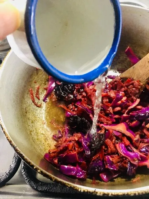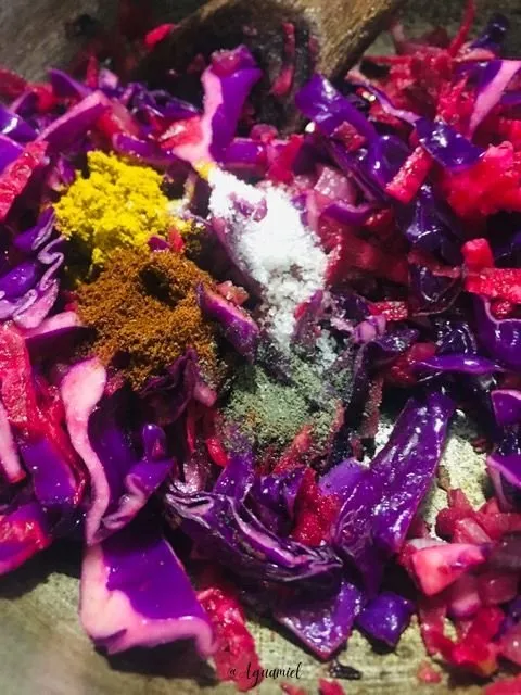 Then add the cabbage and beets, add the spices and stir to integrate the flavors.