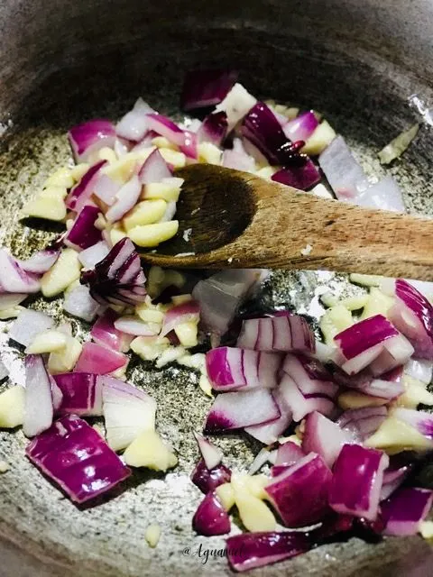 In a hot pot, pan or wok add a splash of olive oil, then add the onion and garlic, stir while their aromas are released.