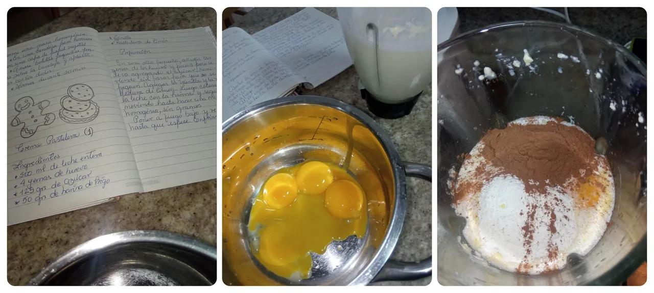 -Se prepara la leche con azúcar en la licuadora y se incorporan las yemas de huevo, la vainilla, el cacao en polvo y la harina.