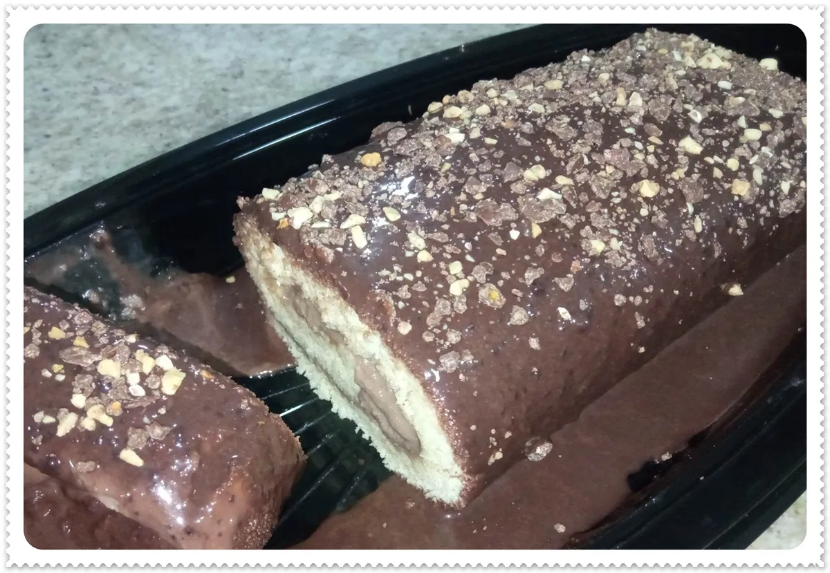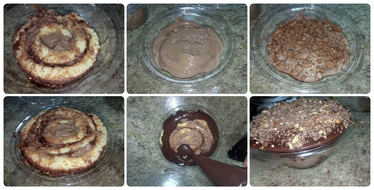 -Luego se coloca otra rebanada del bizcocho, y se le aplica chocolate derretido, y se adorna con galletas, maní y chocolate triturados.