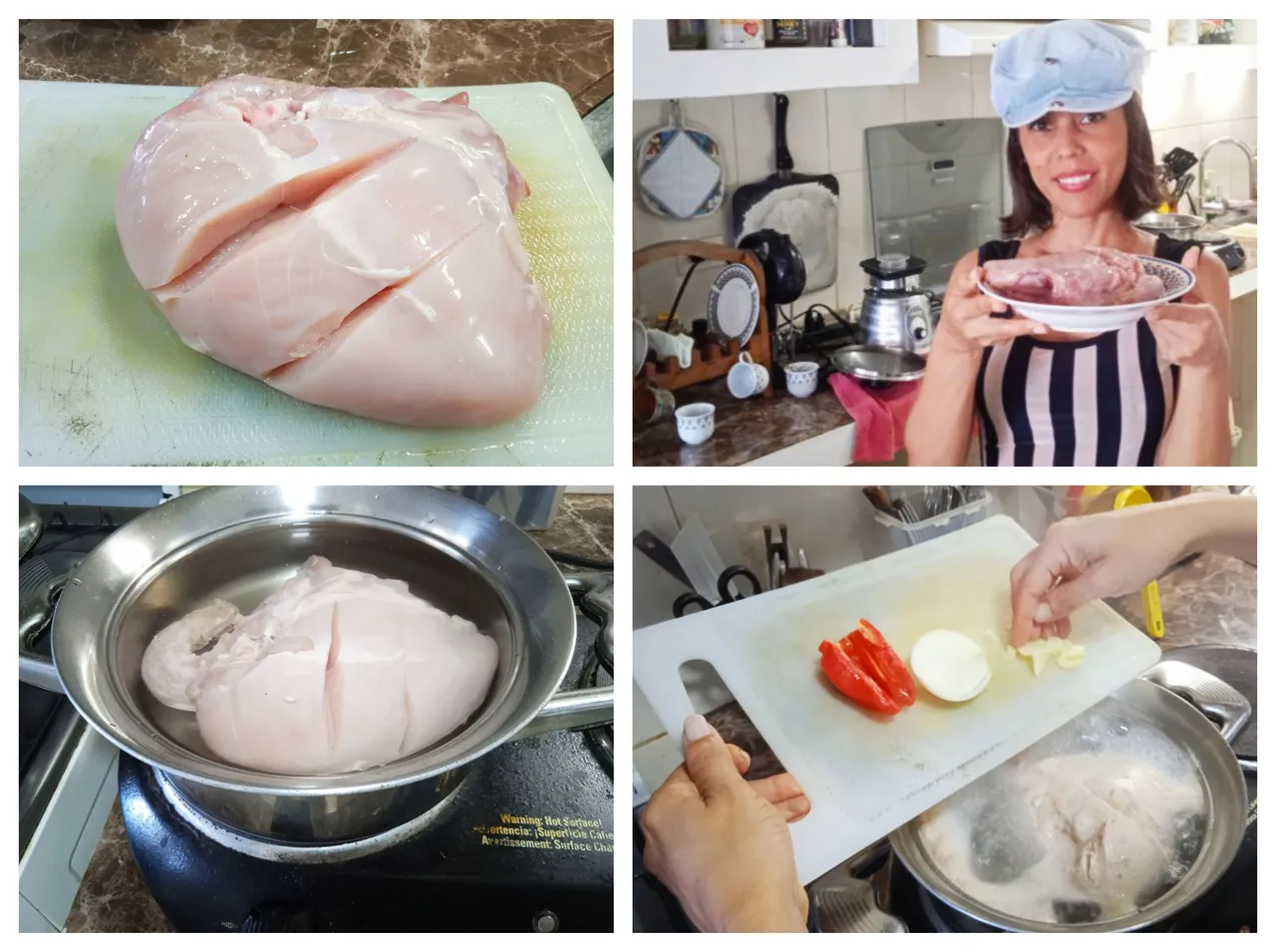 After having cleaned the Chicken Breast well, we submerge it in a pot with water so that it covers it a little and we put it to cook, when the water starts to boil we are going to put the Garlic, Onion and Chili, we let it cook very well for approximately 25 minutes.