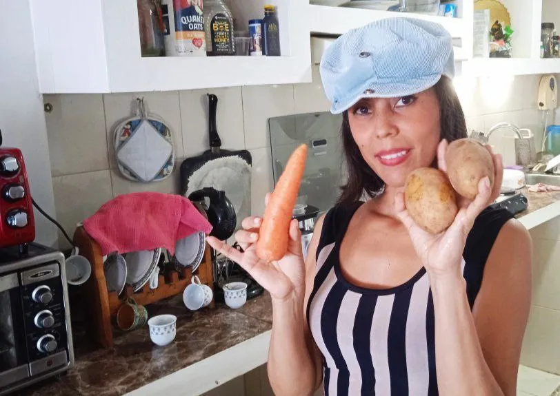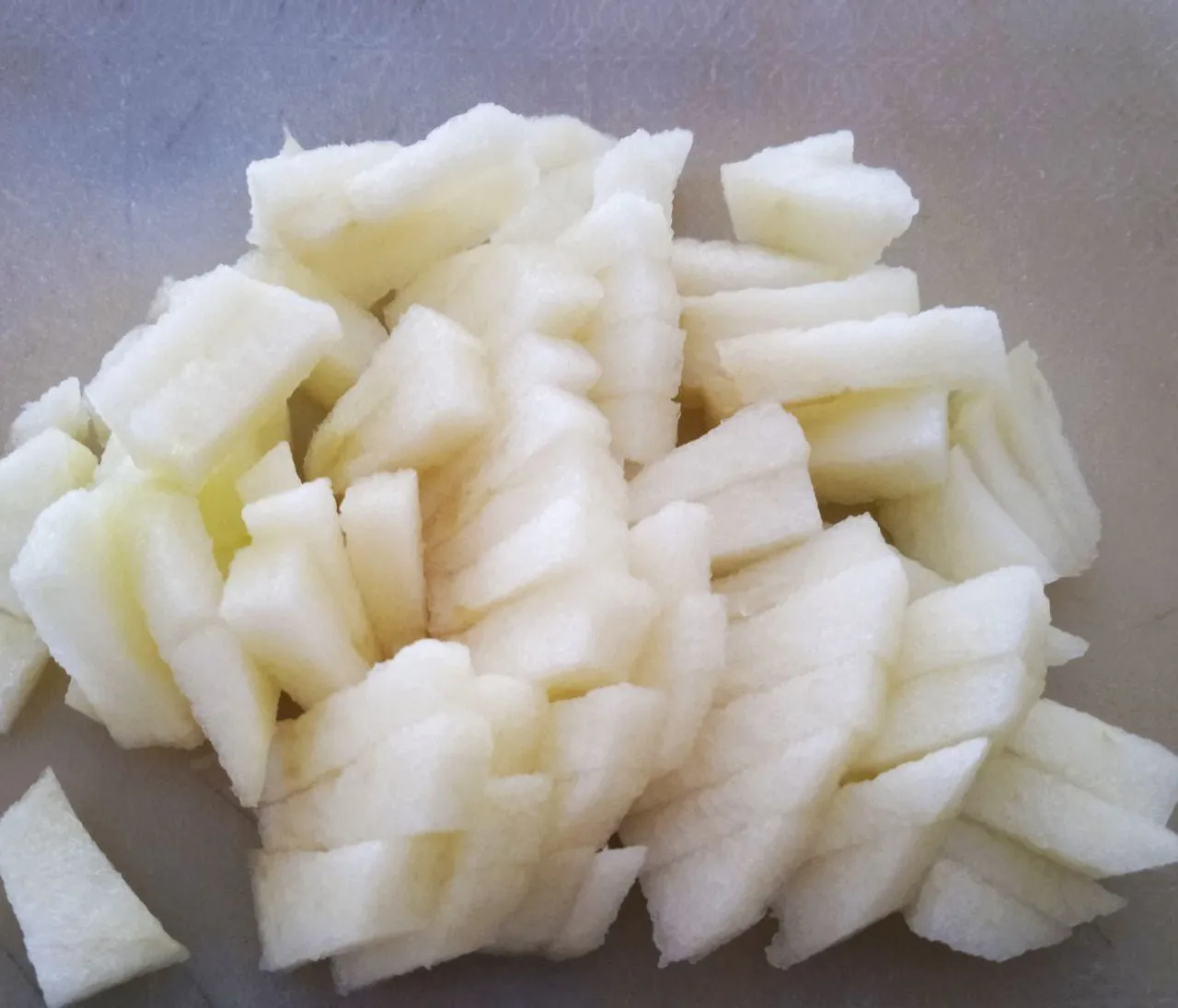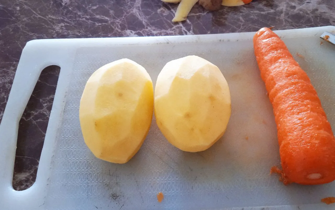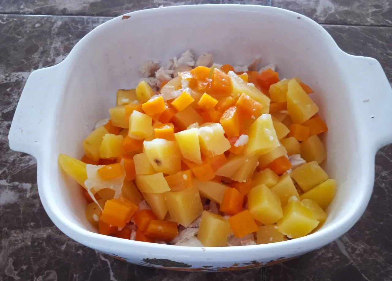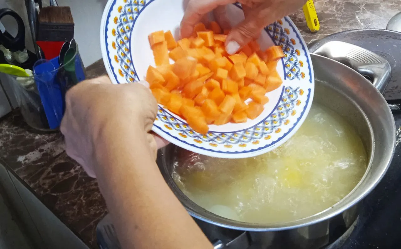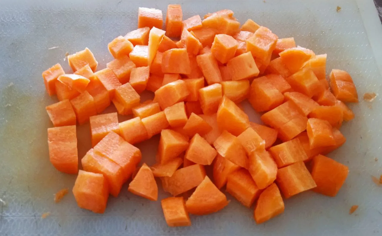 While we let the breast cook, we are going to chop the Carrot and the Potatoes, that we have previously washed and peeled, we chop in small squares, I always like to chop the Carrot a little bit smaller than the Potatoes, we reserve.