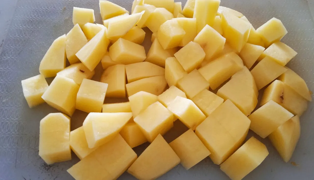 Mientras dejamos cocinar la Pechuga, vamos a picar la Zanahoria y las Papas, que previamente hemos lavado y pelado, picamos en cuadritos pequeños, a mí siempre me gusta picar la Zanahoria un poco más pequeña que las Papas, reservamos.