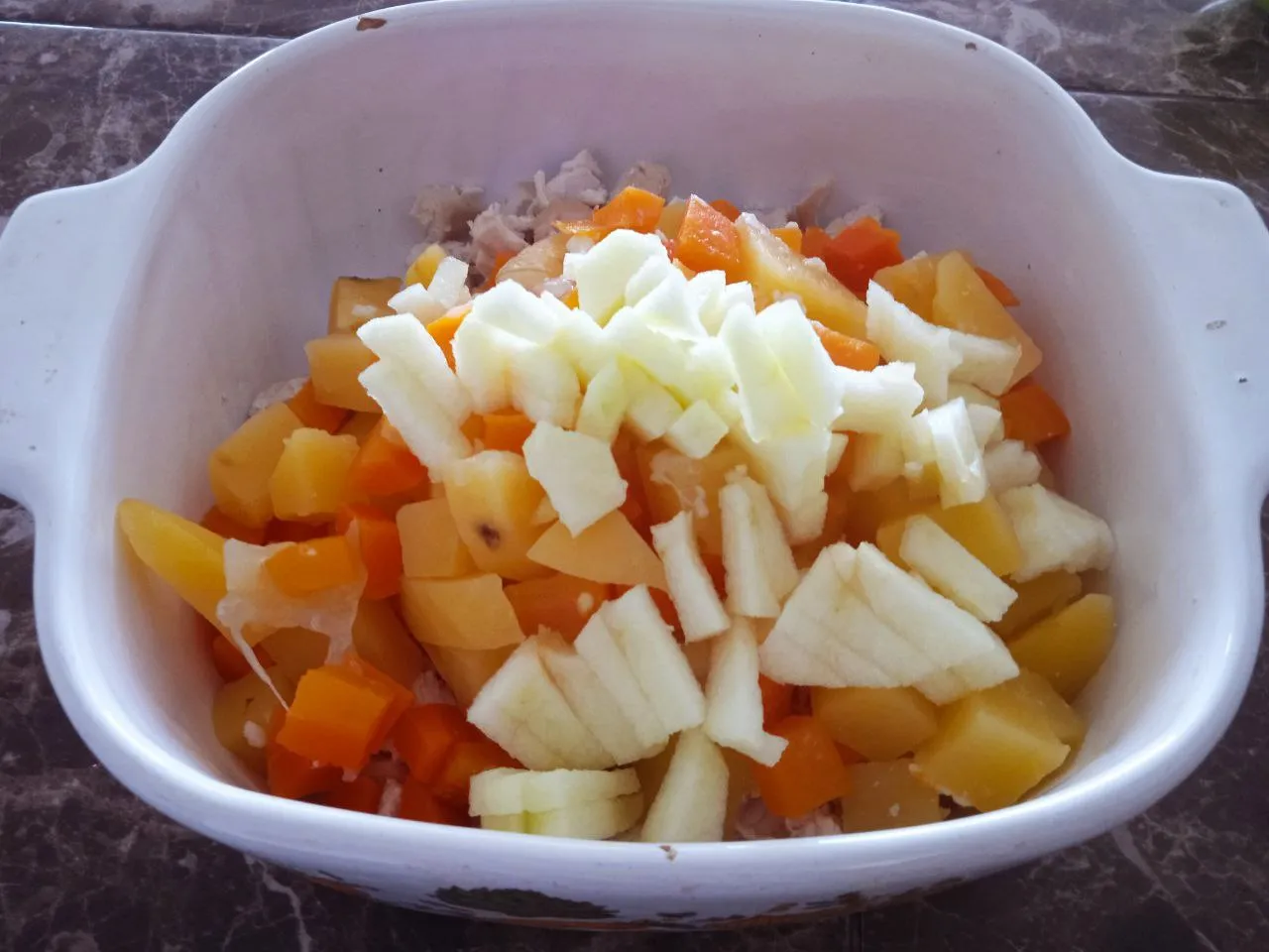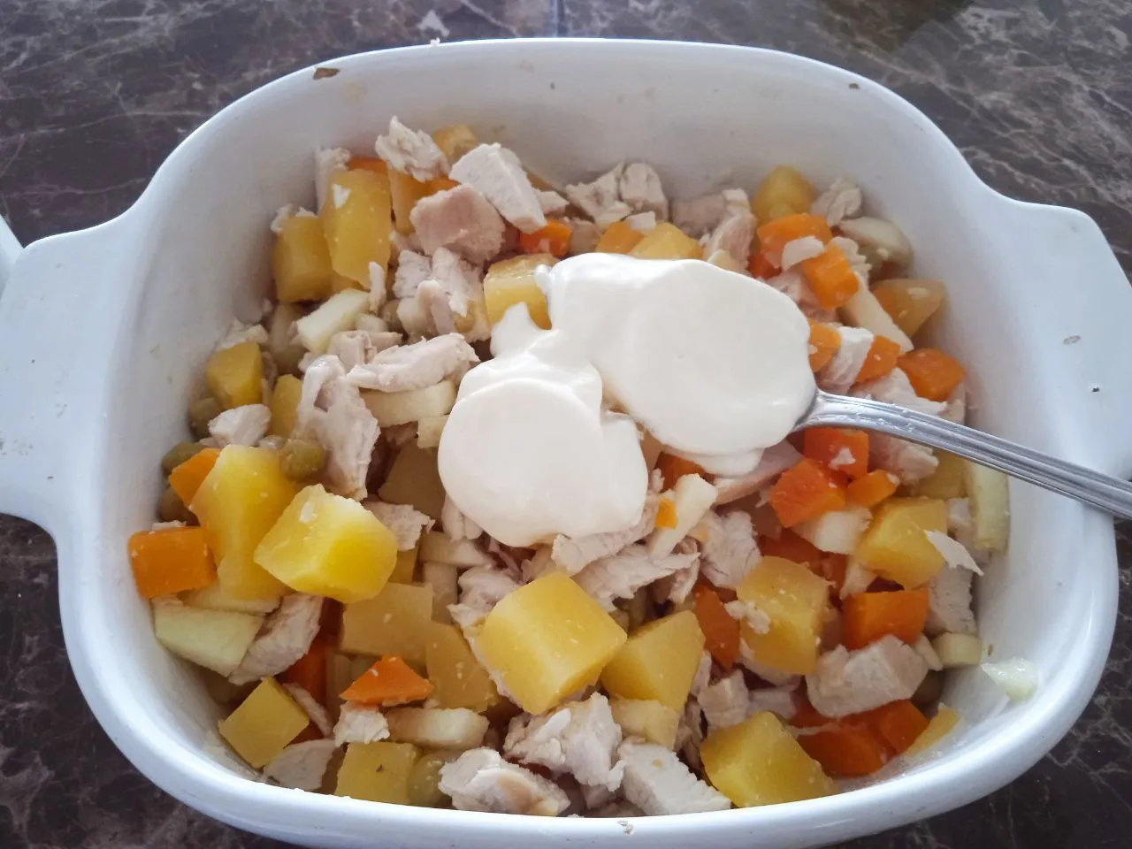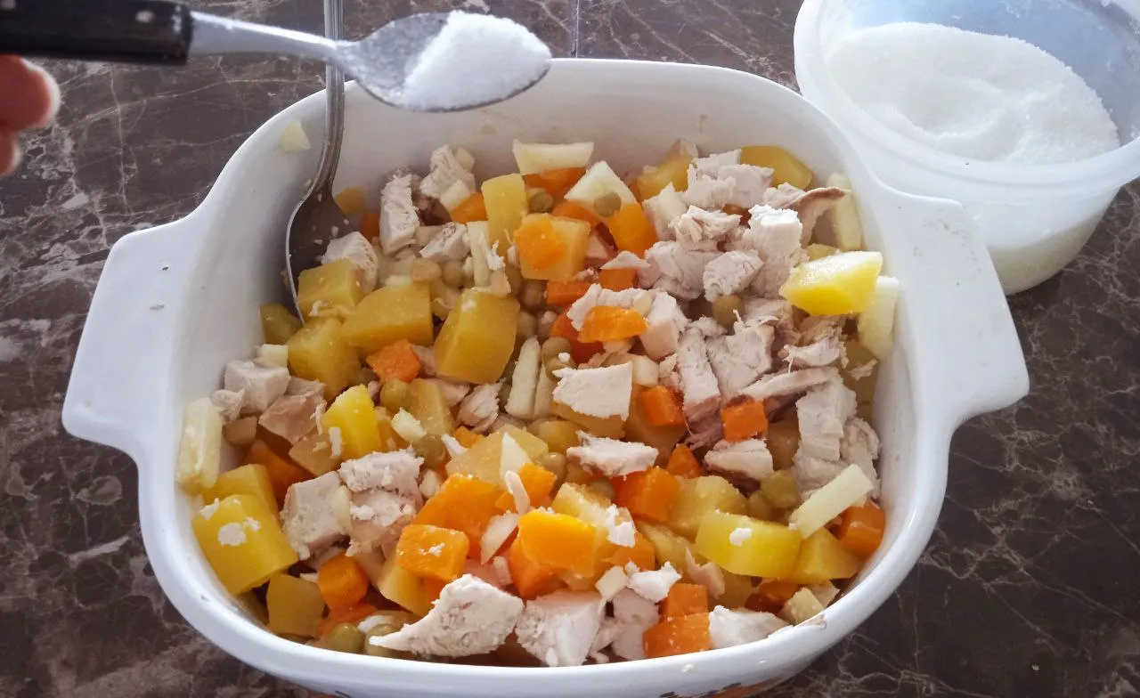 Luego colocamos el Pollo en un recipiente y seguidamente las verduras cocidas. Reservamos.