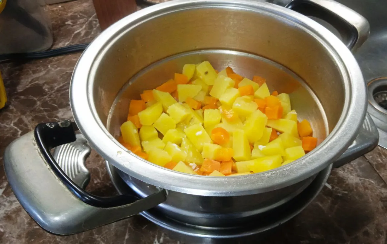 Mientras tanto ponemos a cocinar las Papas y Zanahoria en la misma agua en donde cocinamos la Pechuga de Pollo, eso le dará más sabor a nuestras verduras, dejamos cocinar hasta que ya estén tiernas, aproximadamente 10 minutos.