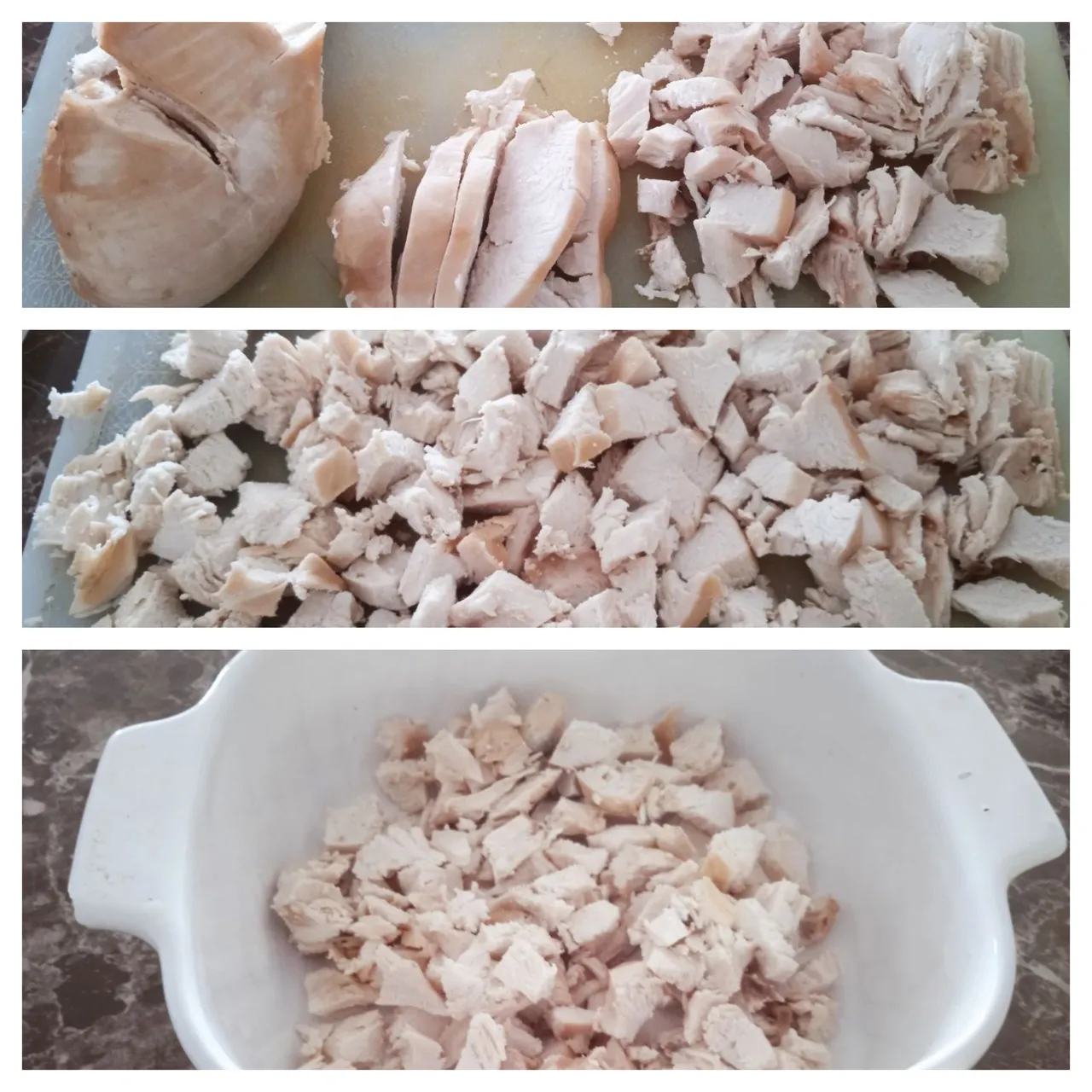 Now we go back to our breast and proceed to chop it into strips and then into squares, you can also shred the chicken, that's up to each person, I like to chop it into squares similar to how I chopped the potatoes.