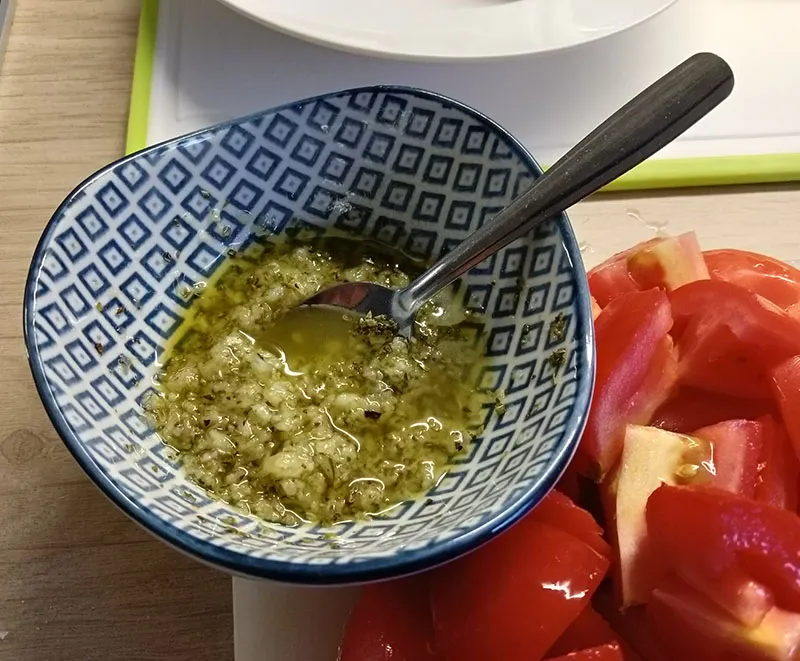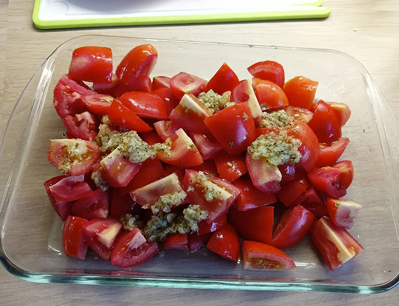 3.- En un bol preparamos una mezcla con ajo, aceite, sal, pimienta y orégano. Mezclamos muy bien y bañamos los tomates con ella.
