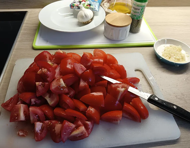 2.- Lavamos y cortamos los tomates en trozos medianos.
