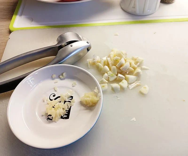 1.- Comenzamos pelando, picando y triturando el ajo